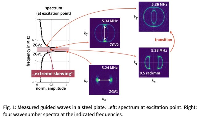 Due to their polycrystalline nature, industrial materials exhibit complex and diverse mechanical behavior. Determining their macroscopic stiffness tensor is not only important for design engineers, but also reveals information about the underlying microstructure. Guided elastic waves in plates are excellent candidates for high-sensitivity and high-accuracy stiffness characterization thanks to their strong dispersion. This is visualized in Fig. 1. Two resonances can be seen in the spectrum. The kX-kY-wavenumber spectra associated to four different frequencies are also depicted. The abrupt change of the wavenumber spectra is due to anisotropy.