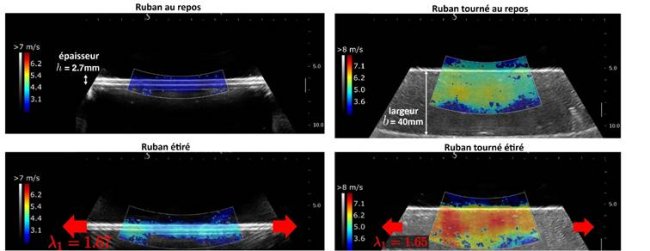 Figure : Cartographie de la vitesse des ondes mesurées dans un ruban de silicone soumis à différentes contraintes mécaniques. La vitesse, représentée en fausses couleurs, permet de déduire la rigidité locale du matériau. Cette mesure est au cœur de l’élastographie, où une interprétation correcte dépend de la prise en compte de la géométrie et de l’état de contrainte du tissu.