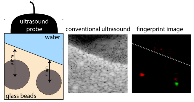 Pour démontrer la généralité du concept, les chercheurs ont réalisé plusieurs expériences dans le domaine ultrasonore. Une première expérience a consisté à détecter et localiser des sphères d’acier enfouies dans un sable mouvant particulièrement diffusant (cf Figure). Une deuxième expérience a démontré l’intérêt de cette approche pour l’imagerie médicale avec la détection de marqueurs de lésion utilisés couramment pour contrôler la résurgence du cancer du sein. Enfin, une troisième expérience a montré comment le concept d’empreinte matricielle pouvait permettre l’imagerie quantitative des tissus en révélant, par exemple, l’architecture des fibres musculaires, une observable particulièrement pertinente pour le diagnostic des maladies cardiaques et des myopathies.